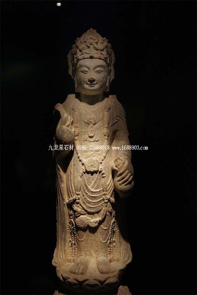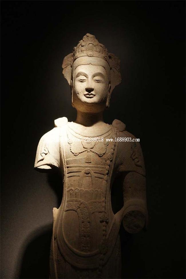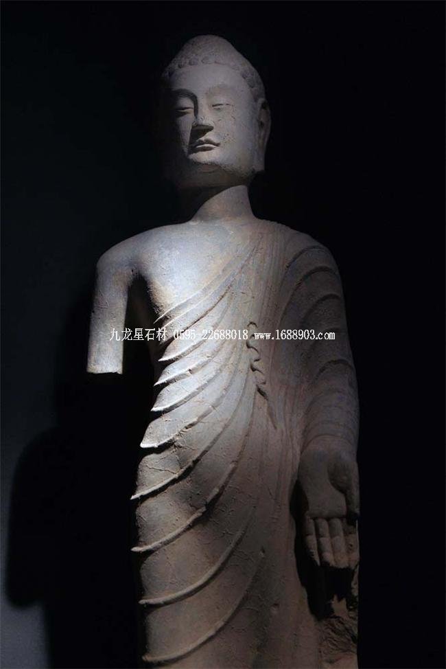 北魏、北齊時期,佛像雕刻藝術(shù)趨于巔峰極致之境界。北魏佛像造型挺拔秀美,細腰寬背,衣紋是富于裝飾的淺刻。北齊造像多為面型豐腴,衣紋簡潔,服薄貼體,整體平潤光潔,與面部寧靜安祥的表情和諧一致。這類疏簡淳潤的佛像造像,無論從光潔的肌體或平滑衣物里,似乎都能感覺到內(nèi)部筋肉的輕微變化。潤澤的體面與舒緩下垂的線條,使形象在疏簡平淡中流露出內(nèi)在的氣質(zhì)。