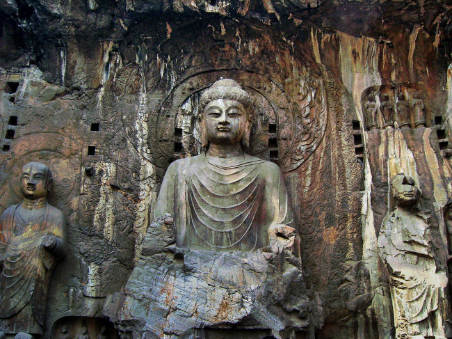 盧舍那大佛造像是河南洛陽龍門石窟造像中的一顆明珠,取材于佛教。眾所周知,佛教由釋迦牟尼創(chuàng)立于古印度,于兩漢之間開始傳入我國,在魏晉南北朝時(shí)期得到了初步的繁榮發(fā)展,出現(xiàn)了大量巨大的佛教造像,如云岡大佛等。唐代詩人杜牧《江南春》中的詩句“南朝四百八十寺,多少樓臺煙雨中”,從中可以看出當(dāng)時(shí)佛教的興盛程度。