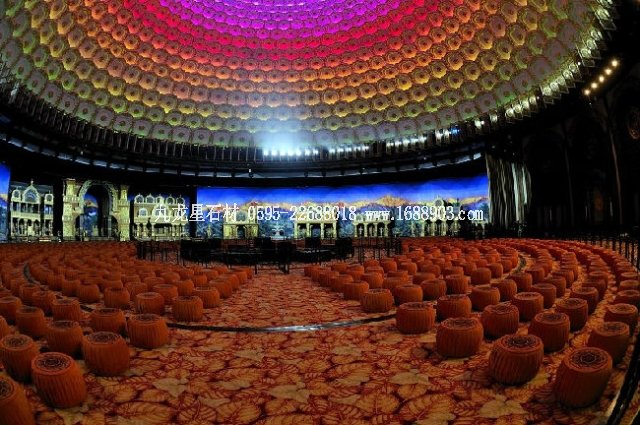 梵宮中最重要的地方莫過于圣壇,這是一個集會議、演出、參觀于一體的圓形場館,也是世界佛教論壇的主會場。建筑面積達35000平方米,可以舉行2000人的大型國際會議。圣壇上方是高度達30多米的巨大穹頂,1500盞金光燦燦的蓮花燈瞬間開啟,剎那間千余盞由電腦控制的LED光源拱聚穹頂,仿佛星光燦爛的天穹,可以變幻出1100多種燈光變化。三維立體的舞臺,可以在1分半鐘內(nèi),在舞臺中央“長出”一棵10米高、12米寬、11萬余片樹葉的參天菩提大樹。同時,在幾十臺大型投影設備和目前世界最為先進的數(shù)字燈光控制系統(tǒng)綜合作用下,營造出一種既似如夢如幻、又似身臨其境的美妙景象。由林兆華、何訓田等組成的國內(nèi)頂尖團隊導演排練的,以弘揚傳統(tǒng)文化、啟迪心靈智慧為主旨的大型情境演出《覺悟之路》就在此上演。