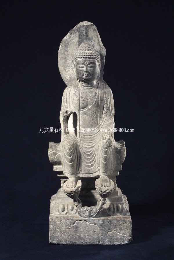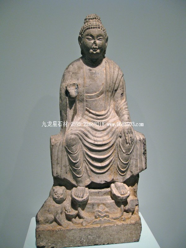 從北齊開(kāi)始,中國(guó)石雕佛像趨向肢體、衣飾質(zhì)感的細(xì)節(jié)刻畫(huà)。至8世紀(jì)的唐代,佛像造型越顯自然寫(xiě)實(shí),雕刻技法精湛,從而形成中國(guó)式佛像的模式。館藏的兩尊彌勒佛堪稱初唐時(shí)期的佳作。未來(lái)佛彌勒在形態(tài)塑造上與釋迦佛幾乎無(wú)異,不同之處在于彌勒佛的坐姿和手勢(shì)。彌勒佛不是盤(pán)腿結(jié)跏趺坐而是倚坐,即雙腳下垂踩蓮花。其手勢(shì)基本上有兩種:一種同交腳彌勒菩薩的手勢(shì),左手握衣角,按左膝,右手作無(wú)畏或說(shuō)法印;另一種是一手心向下按膝,一手作無(wú)畏或說(shuō)法印。這兩尊彌勒佛方額廣頤,臉頰豐滿,衣裟透體,衣紋刻畫(huà)生動(dòng)流暢。整體造型嚴(yán)整自然,神態(tài)顯得平易安詳。
