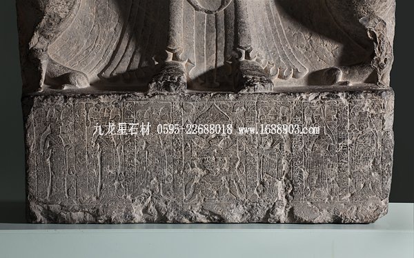 石碑正面雕一佛二菩薩,菩薩腳邊有護(hù)法獅子,現(xiàn)只剩殘?bào)w。佛和菩薩面相清瘦,身軀修長(zhǎng),頭部和手腳近似圓雕,佛裝則以高淺浮雕展示不同層次。如佛身上的漢化褒衣博帶式袈裟和衣裙腳部重疊衣褶的造型。他們身后是火焰形大背光,上面用減地陽(yáng)刻和陰刻手法由中心向外畫(huà)出五個(gè)裝飾圈。中心圈是佛的頭光,內(nèi)有蓮花瓣;旁圈里是過(guò)去七佛;再外圈有六身飛天環(huán)繞,上部有一人形神獸頂一香爐,飛天或持蓮苞、香熏和樂(lè)器,姿態(tài)飄逸清揚(yáng);在此圈的尖頭部分又畫(huà)出第四圈,內(nèi)含一佛像,禪定趺坐于蓮花寶座上,側(cè)脅兩個(gè)飛天;最外圈是飛動(dòng)的火焰圖案。