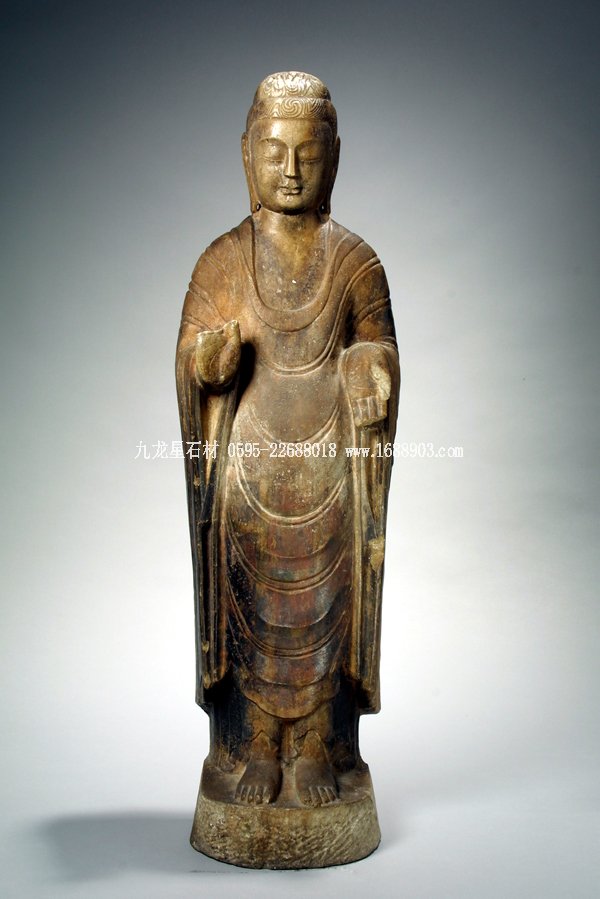 20世紀(jì)50年代在河北省曲陽(yáng)縣修德寺發(fā)掘出兩千余尊石造像,其中多有北齊和隋朝的紀(jì)年造像。曲陽(yáng)(古屬定州)一帶盛產(chǎn)大理石,在6世紀(jì)時(shí)已是佛像制作中心之一,至今仍有“雕刻之鄉(xiāng)”的稱謂。館藏思維彌勒像和立佛像,從材質(zhì)和風(fēng)格來(lái)看,應(yīng)歸屬于同時(shí)代的當(dāng)?shù)刈髌贰A⒎鹣裆碥|雖然仍較扁平,但總體輪廓線圓潤(rùn),腹部微向前凸起,增添了視覺(jué)上的體積感。佛著通肩袈裟,衣薄貼體,U形衣紋用雙鉤陰線,平行下垂的間距遞減,富有節(jié)奏感,為同類作品所罕見(jiàn)。佛左手施與愿印,右手施無(wú)畏印,有漩渦發(fā)型,高肉髻,臉形方圓,面容親切,是北齊佛像的精品。