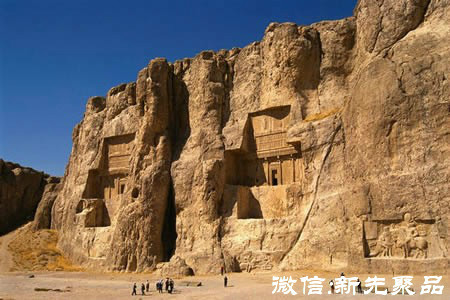 Naqsh-e Rostam被考古學(xué)家認(rèn)為是波斯波利斯的一座墓地,阿契美尼德,帕提亞和薩珊皇族被安葬在此處。其位于伊朗法爾斯省的波斯波利斯西北3,4公里處,這里擁有一些皇室陪葬品,其中包括:埃蘭王朝(公元前2世紀(jì)),阿契美尼德王朝(公元前550-330年)以及薩珊王朝(公園226-651年)。自從前阿契美尼德時(shí)期唯一幸存的紀(jì)念浮雕也差點(diǎn)在巴赫拉姆二世的審判現(xiàn)場(chǎng)被毀滅。Naqsh-e Rostam 是由白色和灰色的石灰石建造而成,并沒有使用任何的砂漿。據(jù)說,波斯人首先使用色彩來裝飾石雕的。Naqsh-e Rostam石雕的特點(diǎn)就是使用了色彩裝飾。這里好多景點(diǎn)的銘文和雕刻都覆蓋著青金石色。有證據(jù)表明,大流士雕像有著青金石藍(lán)的胡子,黑色的頭發(fā)和眉毛,紅色的眼睛和嘴唇,甚至鞋子也是有顏色的,盡管隨著時(shí)間的流逝,那些色彩逐漸褪去。