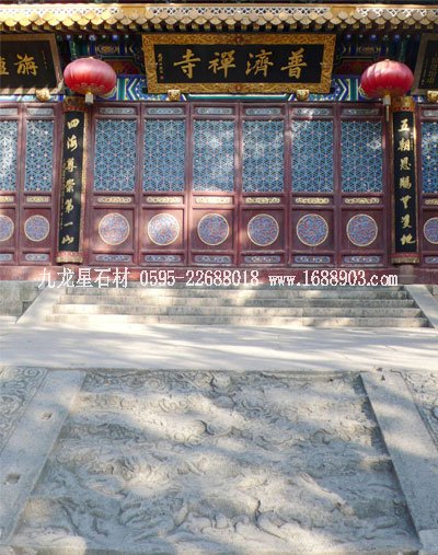 雕龍欄板:在法雨寺玉佛殿前,共有13塊,每塊高約0.5米,寬約1米,各浮雕一云龍,造型逼真,形態(tài)各異,俗稱“云龍游天”石刻欄板,為明代遺物。