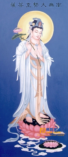 大勢至,音譯摩訶娑太摩缽缽羅缽跢。意譯作“得大勢”、“大精進(jìn)”。略稱勢志菩薩、勢至菩薩。此菩薩以智慧光普照一切,令眾生離三涂,得無上力;又彼行時(shí),十方世界一切地皆震動,故稱大勢至。與觀世音菩薩同為西方極樂世界阿彌陀佛之脅侍,世稱西方三圣。首楞嚴(yán)經(jīng)卷五念佛圓通章謂,大勢至菩薩于因地時(shí),以念佛心入無生忍,故今攝此娑婆世界之念佛眾生,歸入凈土。又依悲華經(jīng)卷三載,當(dāng)阿彌陀佛入滅后,由觀世音菩薩補(bǔ)其位;觀世音入滅后,則由大勢至補(bǔ)處成佛,掌握化權(quán),號善住珍寶山王如來。