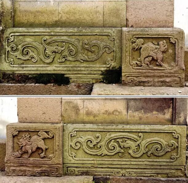 本譜石雕位于德星堂門廳立面的地栿和門枕石部位,粉紅色礫巖的門枕石,如意云頭方框,里面剔地浮雕麒麟圖案。上圖大門左側(cè)為雄麒,全身披麟。青石地栿,平雕陽(yáng)刻卷草螭龍紋。下圖在大門右側(cè)的門枕石雕雌麟,全身披毛,青石地栿,平雕陽(yáng)刻卷草鳳紋。龍鳳呈祥,代表富貴吉祥。麒麟送子,天降祥瑞。