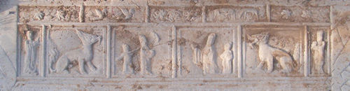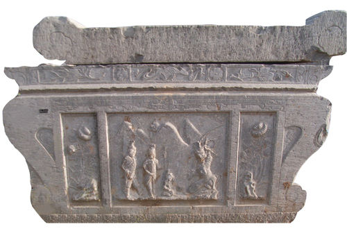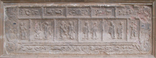 清人物紋石供桌座(圖13) 高70厘米,長(zhǎng)132厘米,寬57厘米。