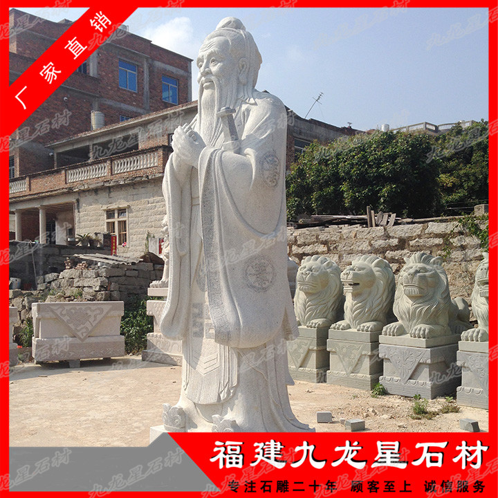 孔子石雕像樣式選擇性不算太大,現(xiàn)在我們看到的孔子形象大多是根據(jù)唐朝的吳道子所畫的孔子像來進行創(chuàng)作雕刻的,長眉長須,身著寬大的儒服,衣袂飄飄,栩栩如生,因此非??简灥窨處煾档墓に?,達到石雕像的真實感,表情惟妙惟肖。一般比較常見的孔子石雕像有比較簡單的頭像,也有站姿的石雕像,基本上站立姿勢的石雕像選擇性更受到人們喜愛,有手里握著書卷拿在胸前,一手背在身后,抬頭挺胸,眼神眺望的石像,也有將雙手交叉并在胸前,但是我們可以看到交疊的手是不露出大拇指的,象征著謙恭有禮,而四指并攏,也代表著四海之內(nèi)皆兄弟,有著友愛、友誼的象征意義。