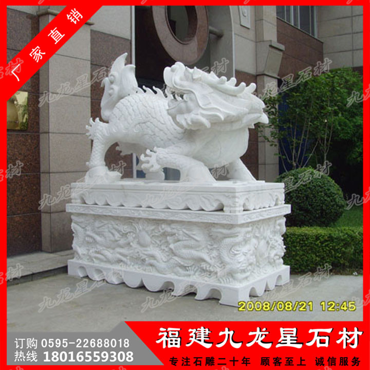 石雕漢白玉麒麟是中國傳統(tǒng)工藝品之一。民間認(rèn)為麒麟有鎮(zhèn)宅辟邪,增添家中吉祥的作用。麒麟是古代的仁獸,集龍頭、鹿角、獅眼、虎背、熊腰、蛇鱗、馬蹄、豬尾于一身,乃吉祥之寶,從古到今都是公堂上的裝飾,以振官威之用,也是權(quán)貴的象征。