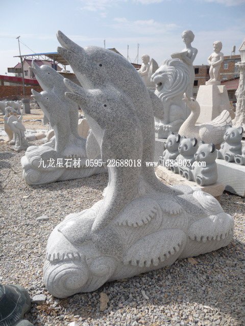 此尊石雕海豚雕塑總體高1.6米,材質(zhì)為G603花崗巖。